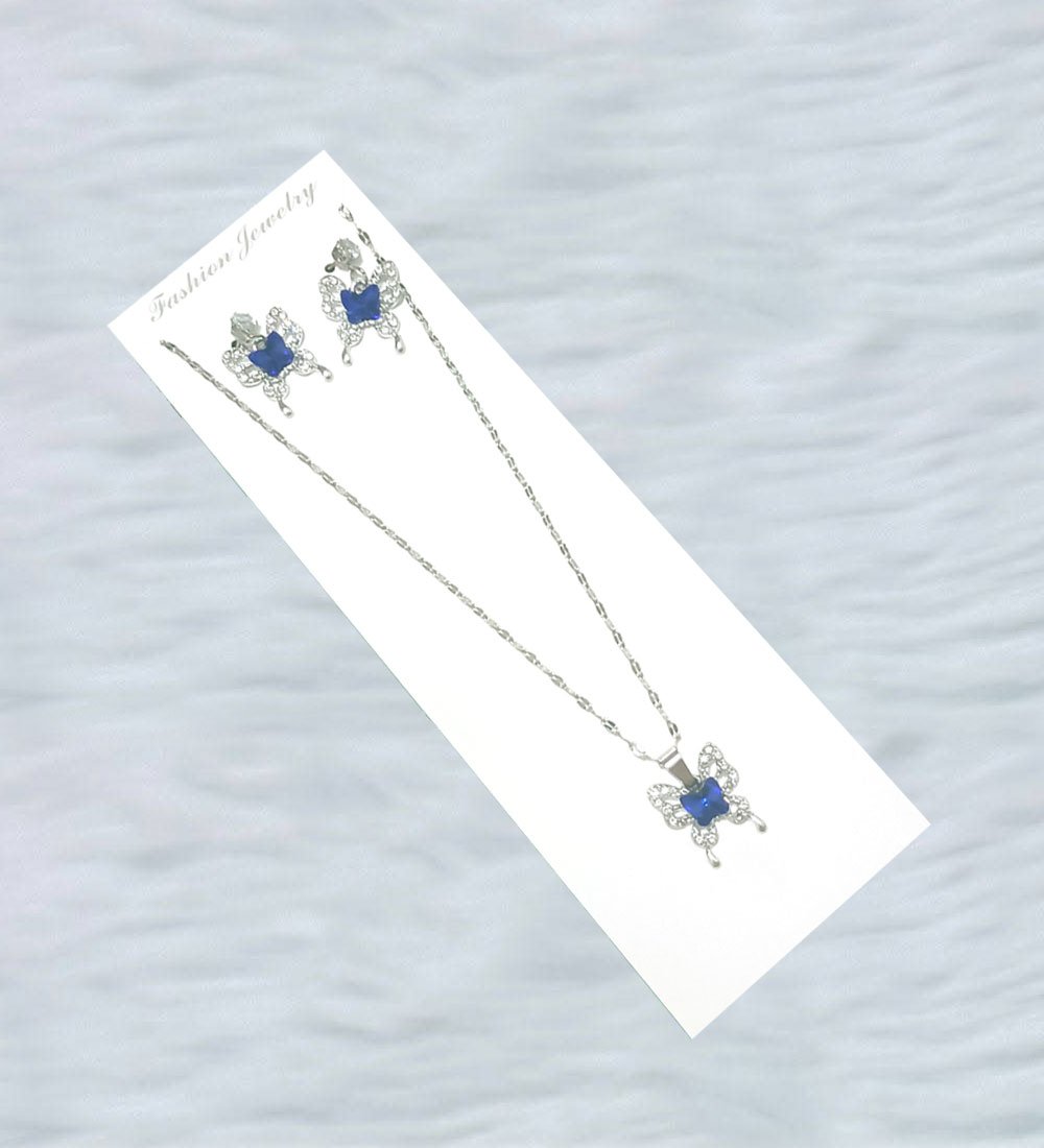 Delicate butterfly-shaped jewelry set featuring blue center stones and clear accents. Includes a matching pendant necklace and stud-drop earrings for soft glam styling.