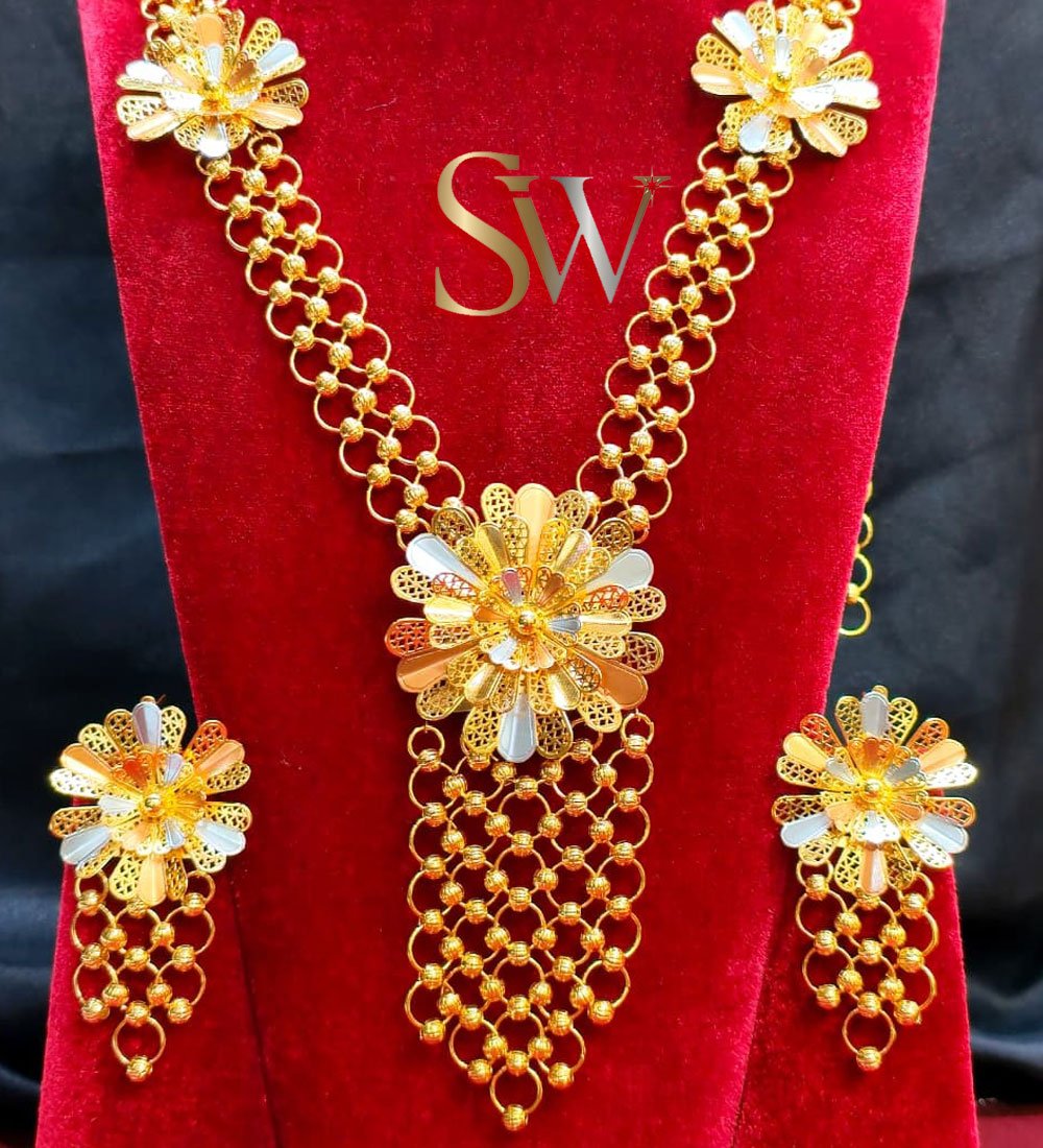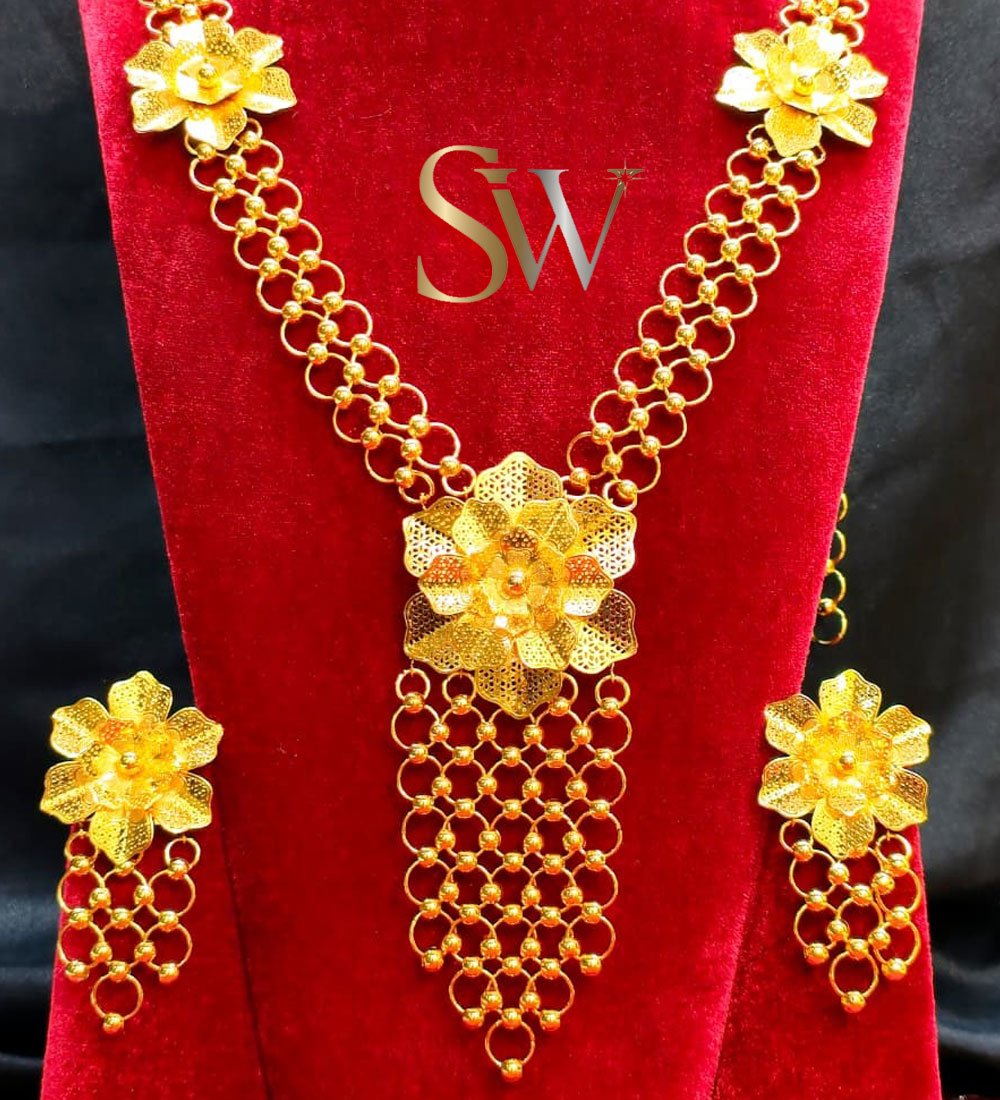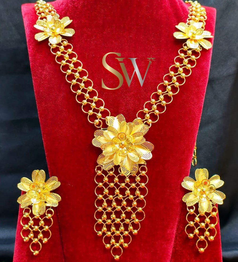 Elevate your traditional look with this elegant Dubai Gold Polish Necklace and Earrings Set, featuring intricate floral motifs and a rich gold finish—perfect for weddings, parties, and special occasions.