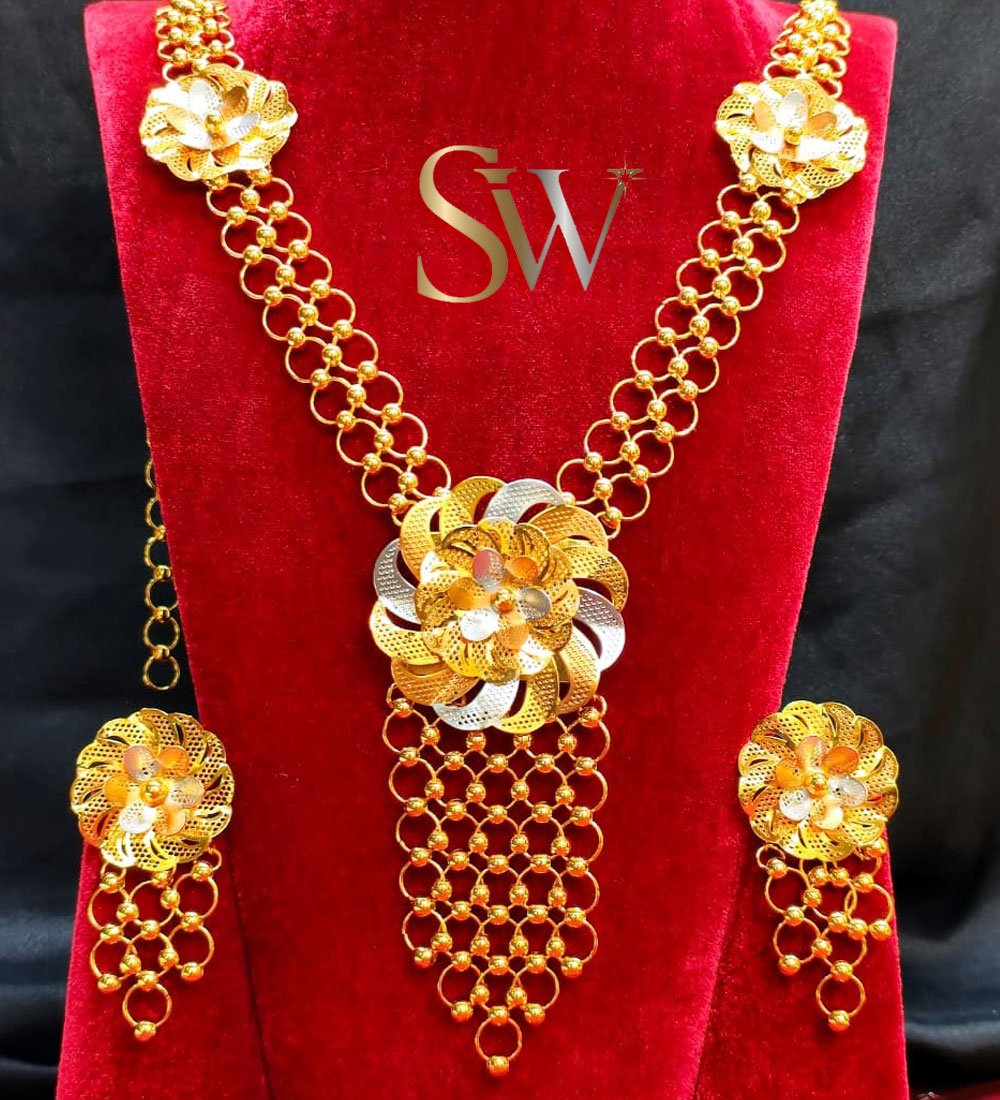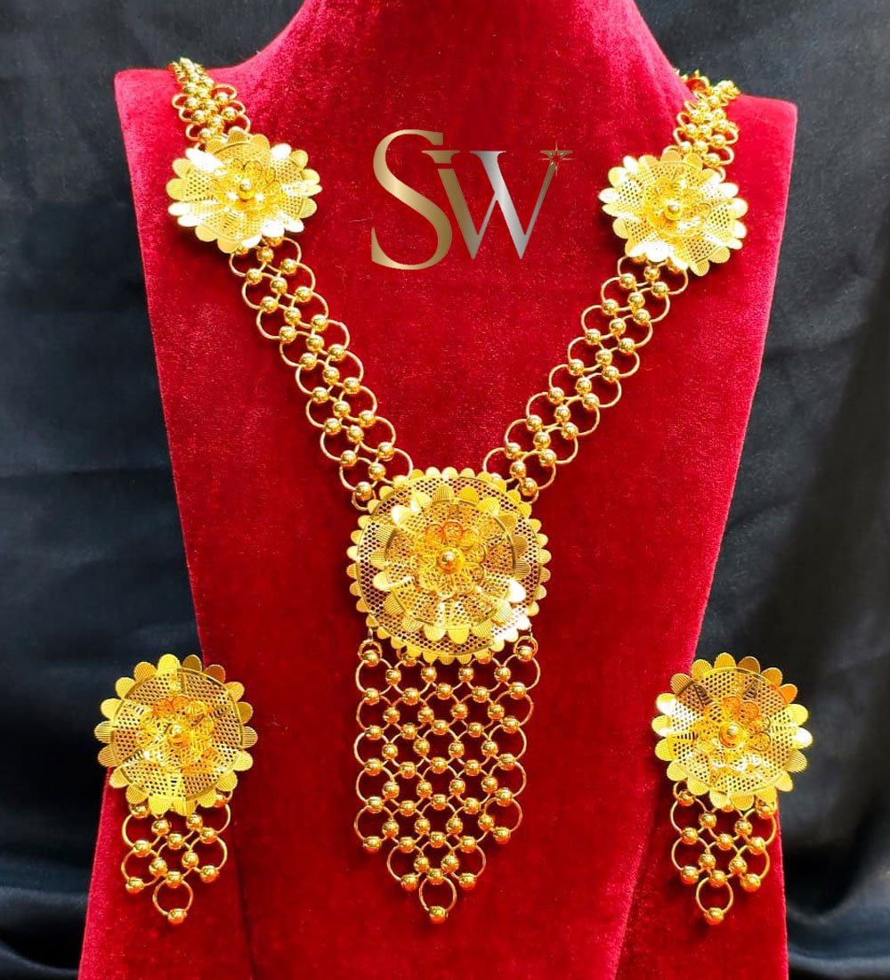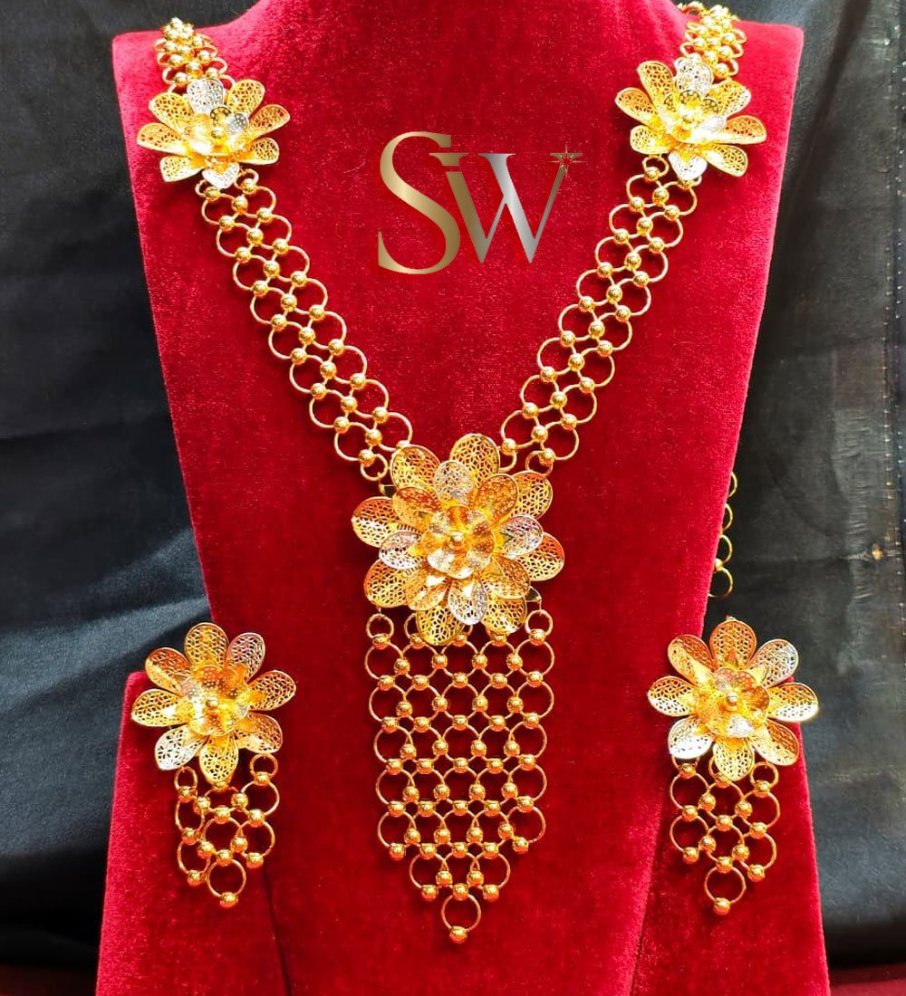 Elevate your traditional look with this elegant Dubai Gold Polish Necklace and Earrings Set, featuring intricate floral motifs and a rich gold finish—perfect for weddings, parties, and special occasions.