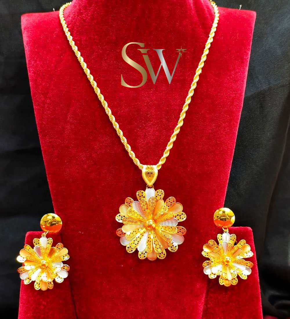 Elevate your festive and bridal look with this elegant Dubai Gold Polish Necklace Set, beautifully crafted with a delicate floral pendant design and a twisted rope-style chain. The matching earrings complete the set, creating a graceful and luxurious appearance inspired by traditional gold jewelry.