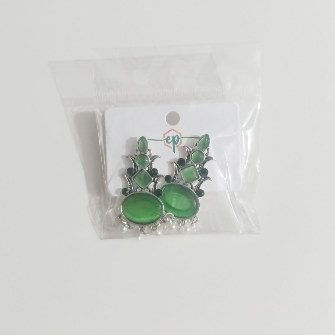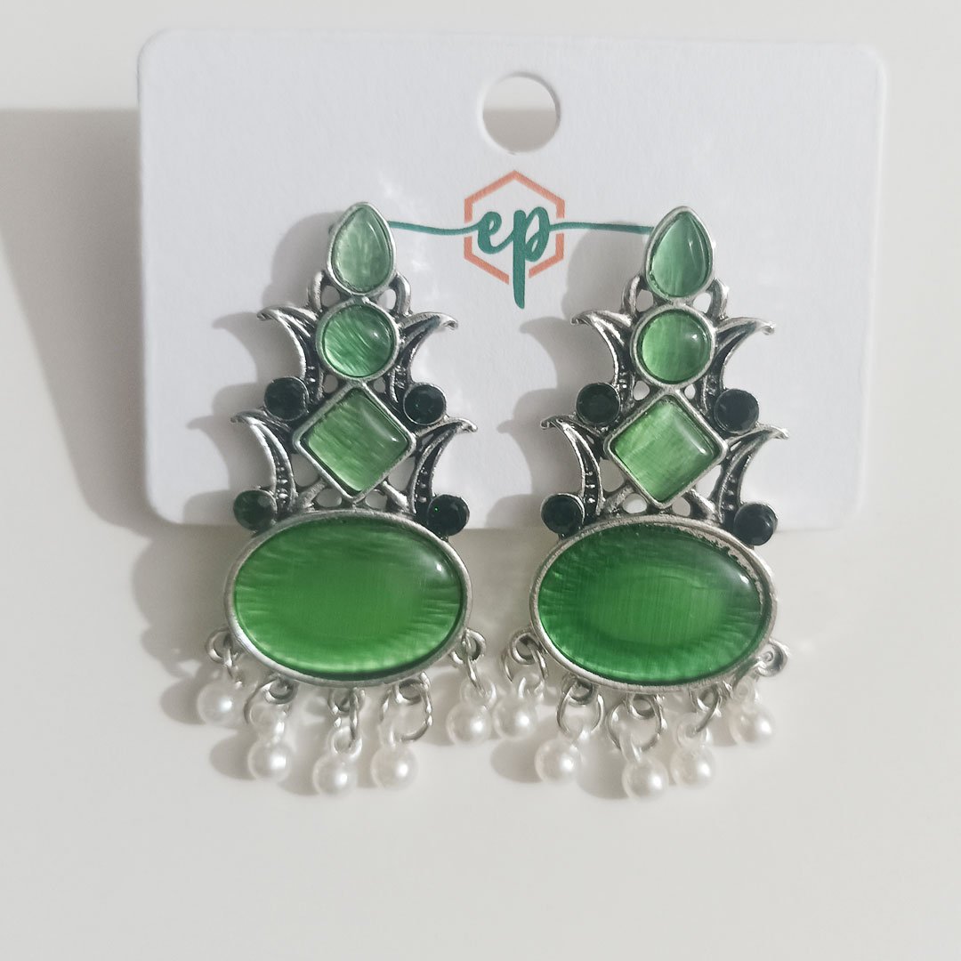 Make a statement with these ornate teardrop earrings featuring rich green stones, black accents, and pearl drops. Their symmetrical design and shimmering silver-toned frame make them ideal for weddings, parties, or any occasion that calls for timeless elegance..