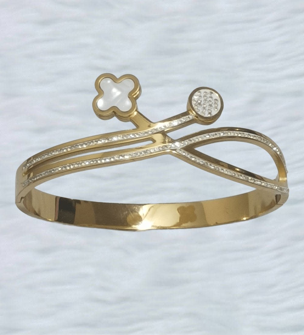This elegant gold bracelet features a looped crisscross design with embedded white stones, highlighted by a four-leaf clover and circular motif. A refined choice for festive styling or premium gifting.