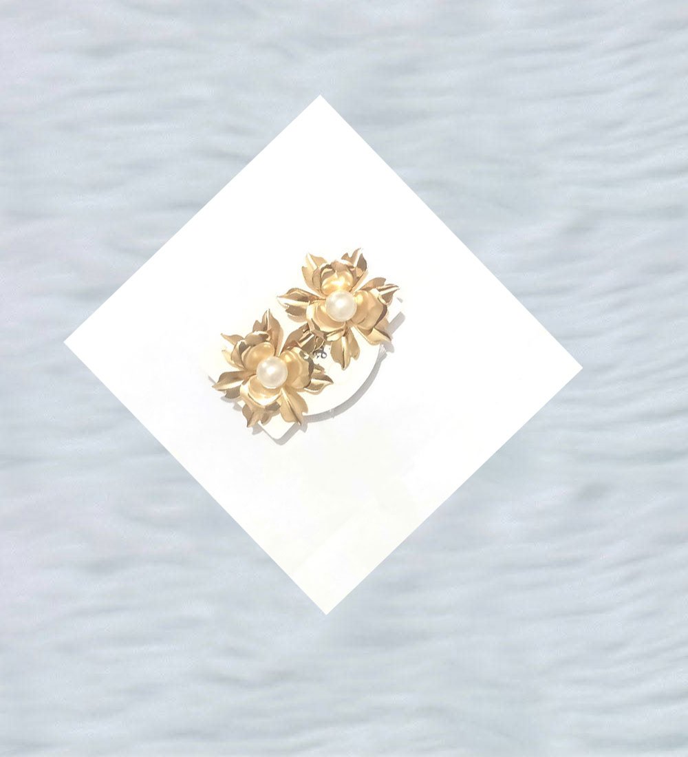 Brand New Gold Floral Pearl Earrings – Vintage Petal Studs with Center Bead