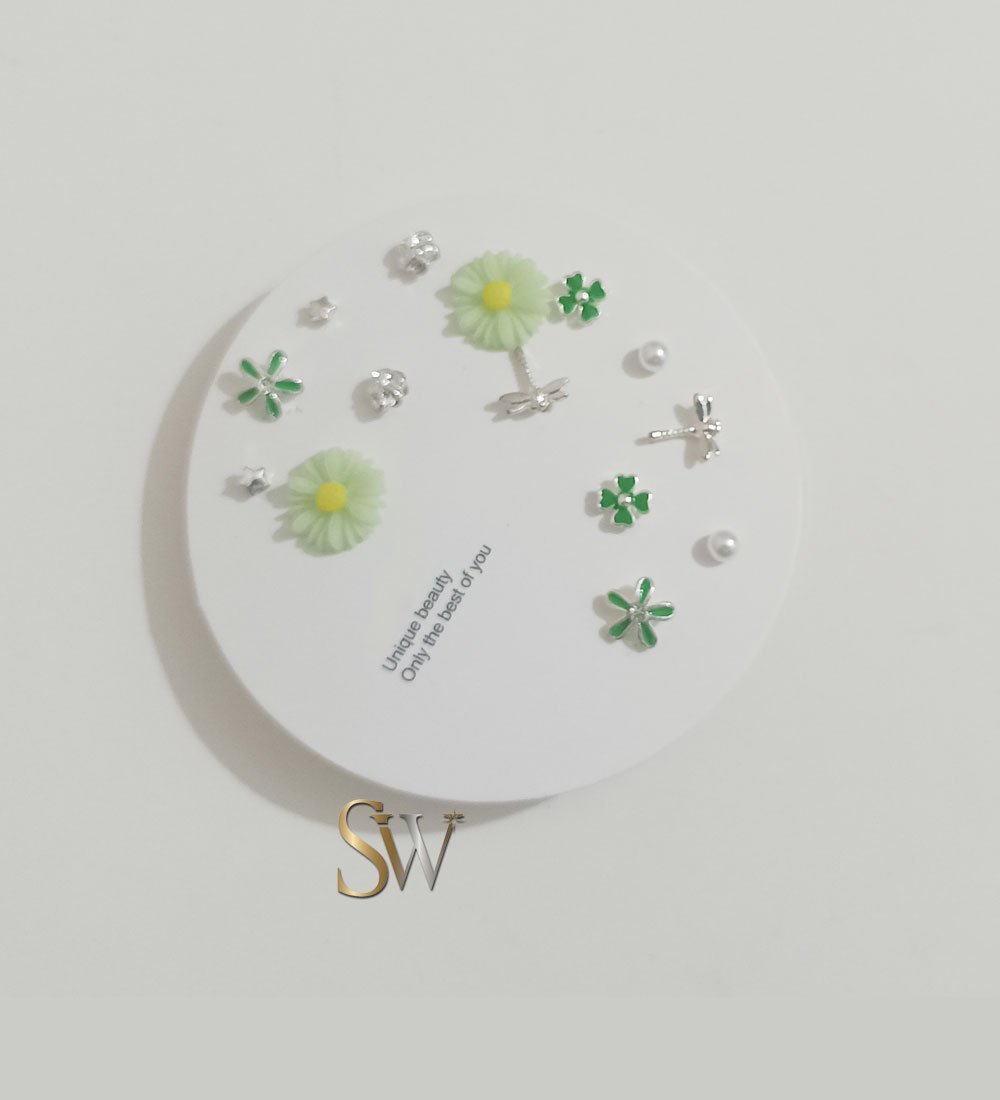 Brand New Green Floral Stud Earrings Combo Set for Girls & Women (6 Pairs)