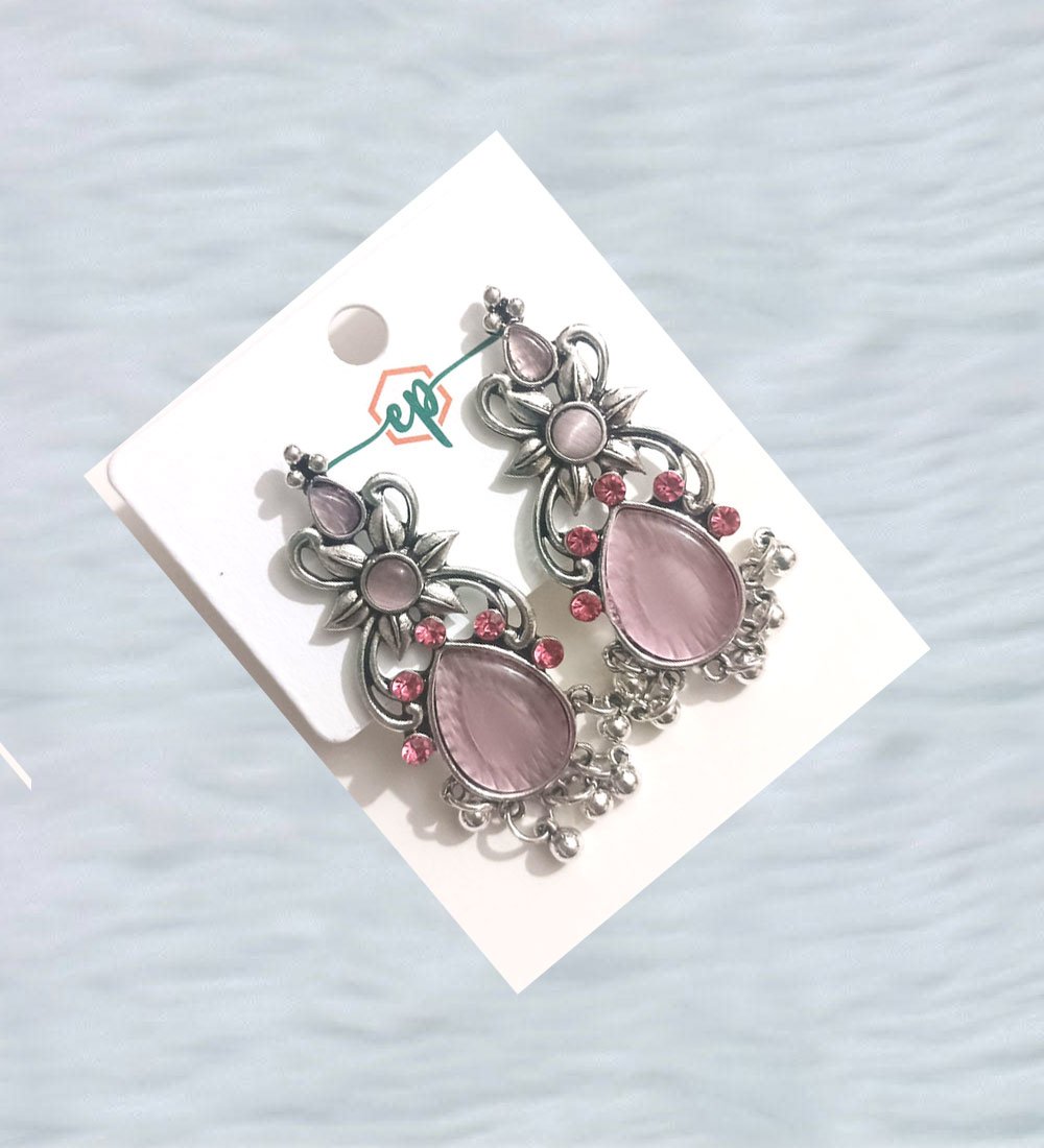 Brand New Pink Gemstone Drop Earrings – Silver-Toned Floral Scrollwork with Teardrop Sparkle