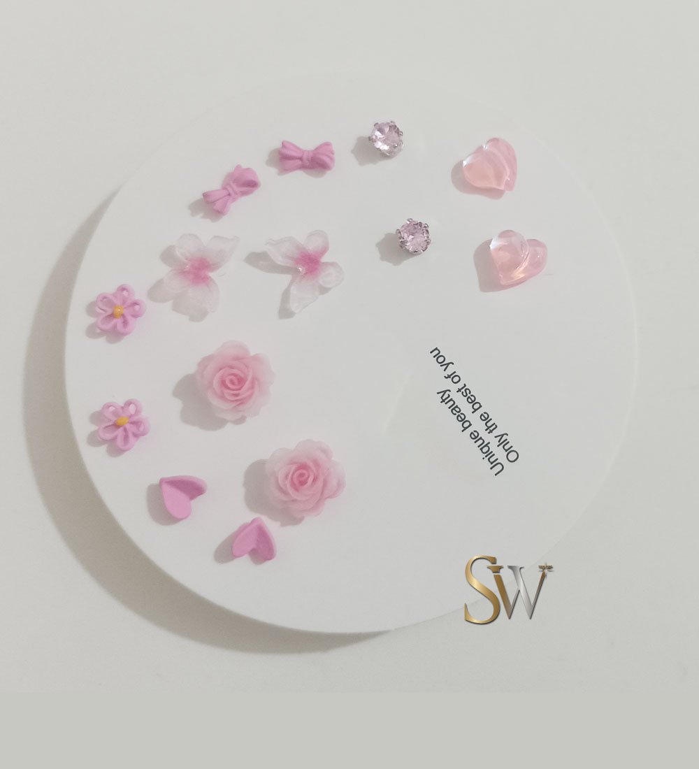 A curated set of pastel nail art charms featuring bows, butterflies, roses, hearts, and gemstones—mounted on a circular SW card. Perfect for DIY glam or creative gifting.