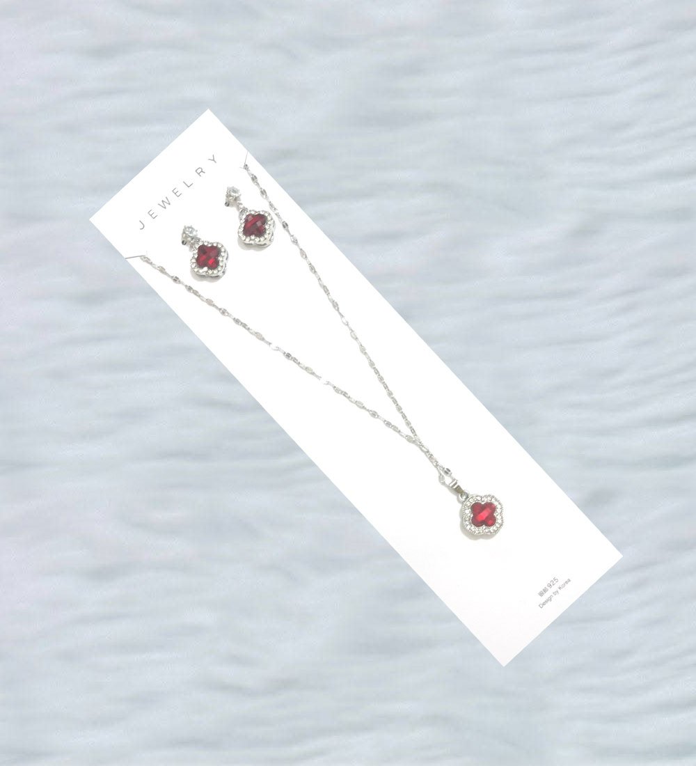 Brand New Red Gem Jewelry Set – Silver-Tone Necklace & Earrings with Decorative Frame