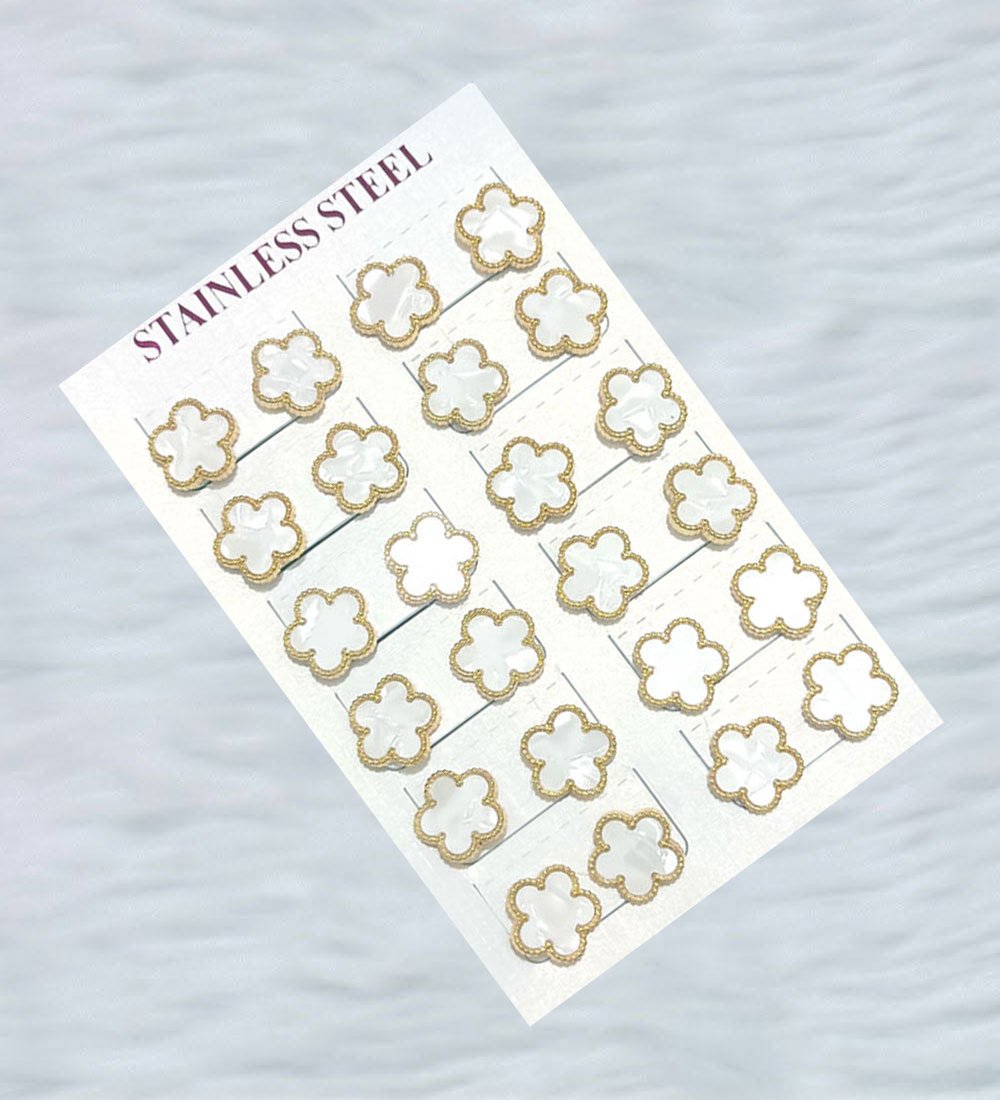 Elegant five-petal flower stud earrings with white centers and gold borders. Comes as a 24-pair set on a stainless steel card—ideal for gifting, bundles, or bulk styling.
