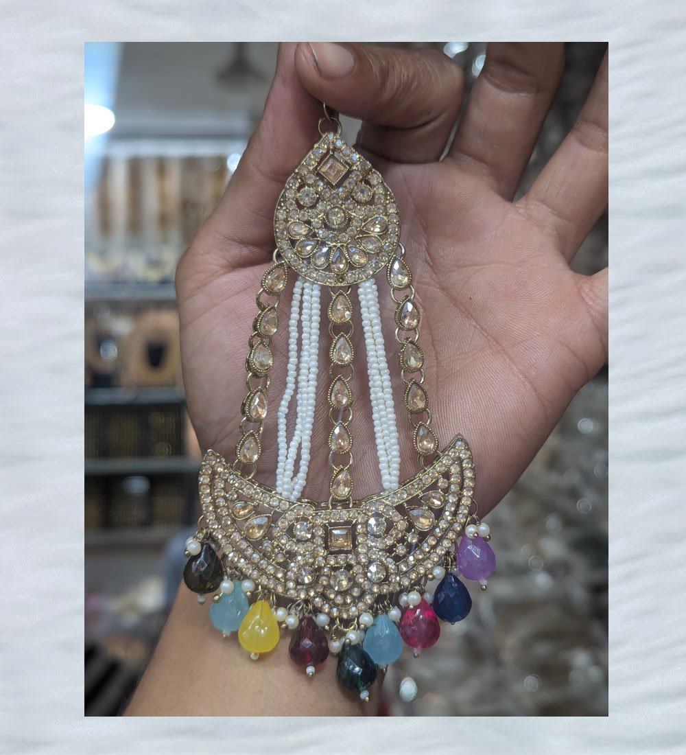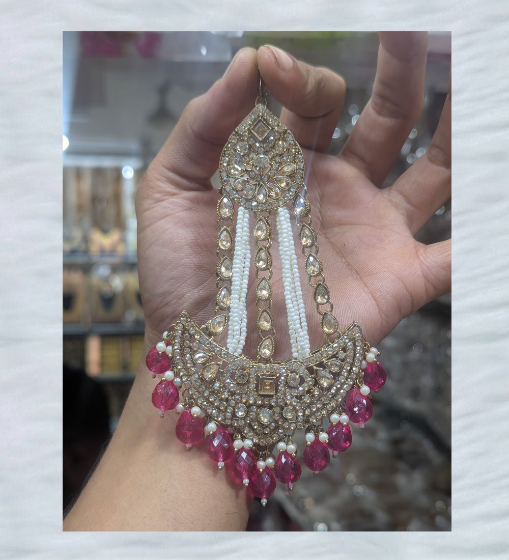 Ornate jhapta-style featuring diamond-cut detailing, white stones, and red bead drops. A regal blend of heritage and sparkle for bridal or festive wear.