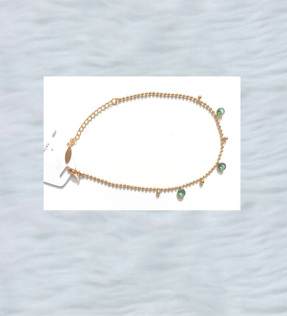 Delicate gold-toned anklet featuring evenly spaced green gemstone charms on a beaded chain. Lightweight, adjustable, and perfect for everyday or festive wear.