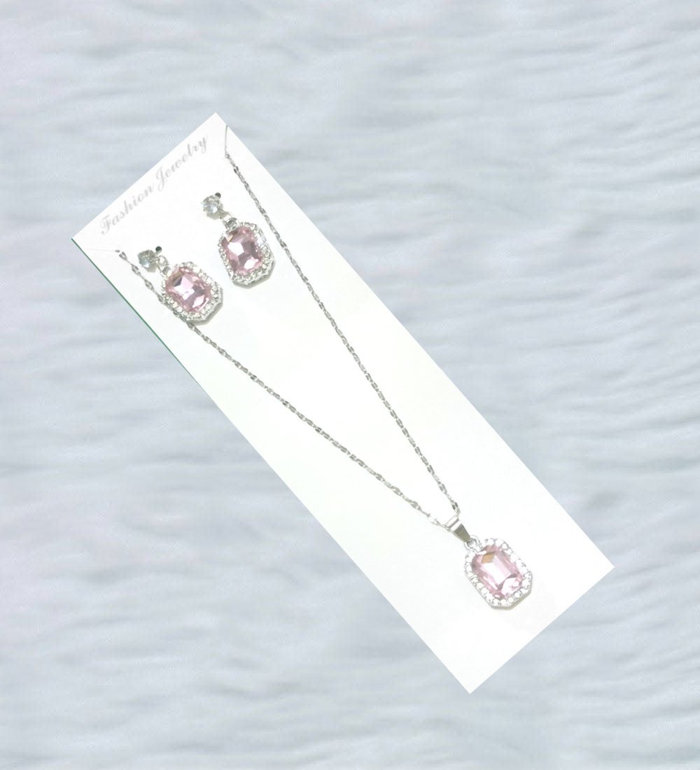 Elegant jewelry set featuring rectangular pink gemstones framed in clear stones. Includes a matching pendant necklace and drop earrings for soft glam or festive styling.