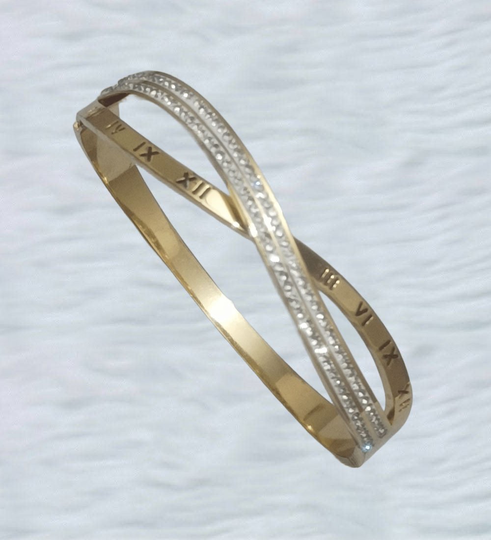 Sparkling Roman Numeral Gold-Toned CZ Bangle (Elegant Minimal Luxury)